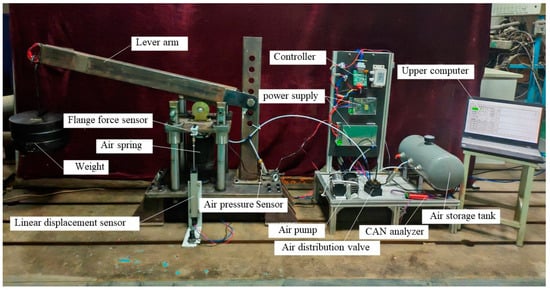 The above equation suggests that its vertical stiffness is mostly dependent on the pressure inside the chamber , the rate of change of effective bearing area with vertical displacement , and the initial volume of the air spring chamber. To ensure the accuracy of the verification of the air spring characteristics, it is necessary to measure important physical quantities such as the load, pressure, and vertical displacement of the air spring and to monitor the changes in these physical quantities in real time, thus ensuring a more ideal experimental effect.