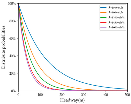 To facilitate the analysis of the road gap distribution under various traffic volume conditions, the probability of headway was calculated according to Equation (9), and the road speed was set to 60 km/h. The result is shown in Figure 1. It can be observed that for the same headway, the distribution probability decreases as the traffic volume increases. As the distribution probability of the headways decreases, the number of available merging spaces on the road segment sharply declines, which inevitably impacts the driving state.