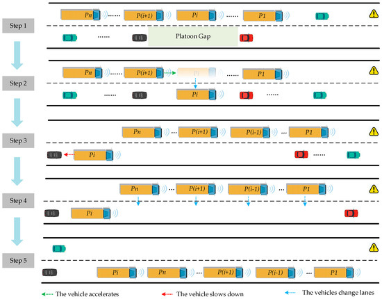The strategy involves the HMT for selected vehicles within the platoon, facilitating stable and efficient platoon lane changes through a coordinated adjustment of the lane-changing space, as depicted in Figure 2. The specific steps are as follows: