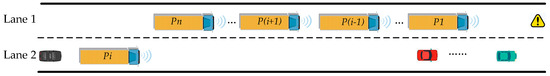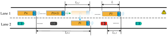 Assume that the spatial relationships between vehicles within the study area are as depicted in Figure 3, where Pi represents the selected leading lane-changing vehicle, and there is a need for the truck platoon in Lane 1 to change lanes to Lane 2. The positional changes during the entire lane-changing process can be divided into two parts as follows: