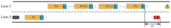 If , indicating that the original platoon leader is selected as Pi, and its position relative to the preceding vehicle in the adjacent lane is behind, thus is less than zero, then the position of the new platoon leader relative to the preceding vehicle does not affect the remaining platoon vehicles’ lane changes. Hence, there is no need to consider the relative position change between them.