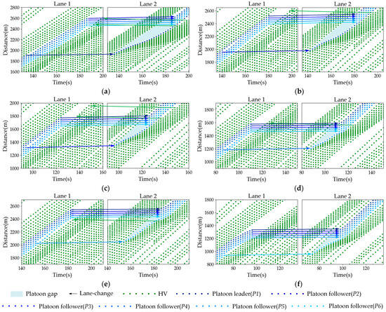 Meanwhile, as shown in Figure 9, the selected vehicle that changes lanes first will have an impact on the lane-changing time of the platoon. When the selected vehicle is the platoon leader, the lane-changing adjustment time of the platoon is the longest. When the selected vehicle is located in the middle of the platoon, the lane-changing adjustment time of the platoon is shorter. When the selected vehicle is the rearmost vehicle of the original platoon, as shown in Figure 9f, the lane-change time of the platoon is greatly affected by the relative position of the platoon leader and the adjacent front car of the selected vehicle.