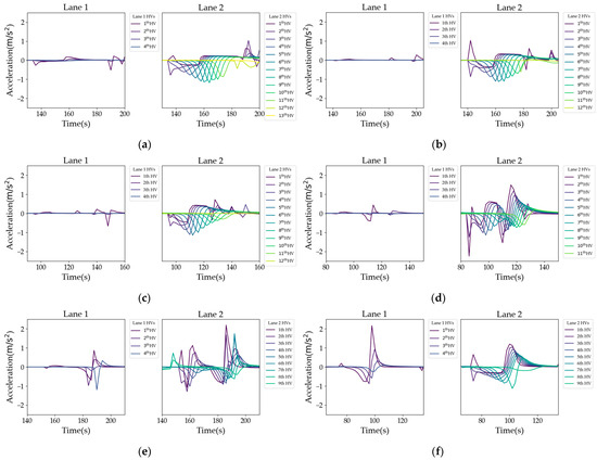 The trajectory of acceleration for upstream vehicles: (a) the first lane-changing vehicle as P1; (b) the first lane-changing vehicle as P2; (c) the first lane-changing vehicle as P3; (d) the first lane-changing vehicle as P4; (e) the first lane-changing vehicle as P5; and (f) the first lane-changing vehicle as P6.