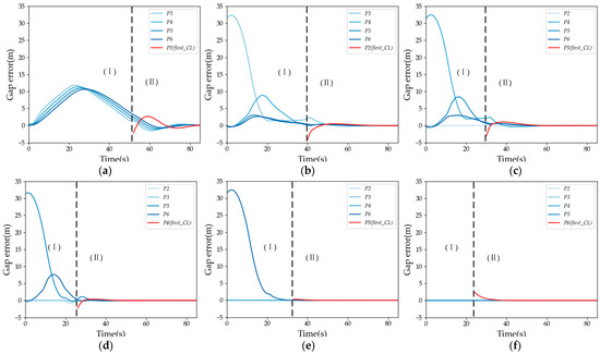 The trajectory of gap error for the platoon: (a) the first lane-changing vehicle as P1; (b) the first lane-changing vehicle as P2; (c) the first lane-changing vehicle as P3; (d) the first lane-changing vehicle as P4; (e) the first lane-changing vehicle as P5; and (f) the first lane-changing vehicle as P6.