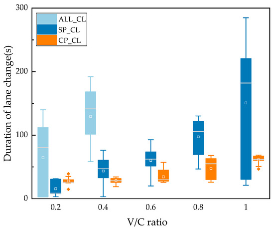 Figure 10 shows the duration of lane changing for ALL_CL, SP_CL, and CP_CL models at different V/C ratios. It can be seen that when the V/C ratio is greater than 0.4, the platoon, which is based on ALL_CL, is difficult to change lanes, indicating that the model relies on good road traffic flow conditions and is difficult to achieve in high-traffic density urban road sections. Compared to ALL_CL, SP_CL and CP_CL are less affected by the V/C ratio. However, SP_CL only considers its own environment when performing lane changes, making it difficult to ensure the continuity of the platoon. As the V/C ratio increases, the duration of SP_CL significantly increases, and the duration distribution of CP_CL is more concentrated and lower than that of SP_CL. This indicates that CP_CL model proposed in this study has stronger robustness and efficiency in the context of random traffic.