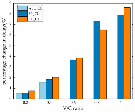 In addition, to further compare the impact of three lane-change guidance strategies on traffic flow, Figure 11 shows the percentage change in traffic flow delay under different platoon lane-change guidance strategies. It can be seen that the three lane-changing guidance strategies have similar adverse effects on traffic flow. In situations where the road traffic environment is good, ALL_CL has the least adverse impact on traffic flow when the platoon changes lanes. This is because ALL_CL relies on good road traffic conditions, and the platoon vehicles do not frequently change lanes. As the V/C ratio increases, the percentage of delay in traffic flow increases, indicating that when traffic conditions are poor, the lane-changing behavior of the platoon has a greater adverse impact on traffic flow. In addition, the delay growth rate of traffic flow under SP_CL is 226.78%, 101.09%, 99.45%, and 6.8% as the V/C ratio increases, indicating that when the V/C is greater than 0.8, the adverse impact of SP_CL on the traffic flow remains stable and is less affected by the V/C ratio. The growth rates of traffic flow delay for CP_CL are 159.74%, 88.78%, 67.95%, and 32.3% as the V/C ratio increases. The growth rates steadily decrease, indicating that as the V/C ratio increases, CP_CL gradually decreases the negative benefits on traffic flow.