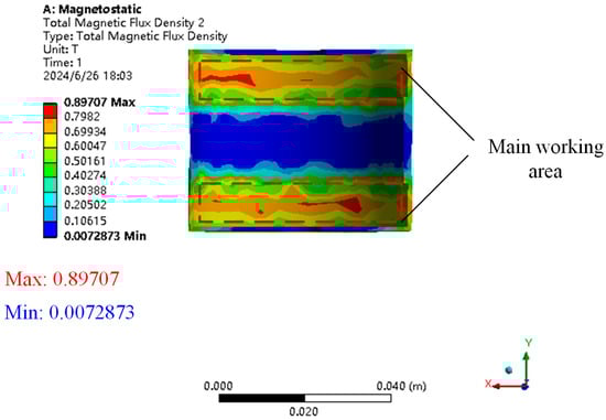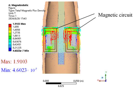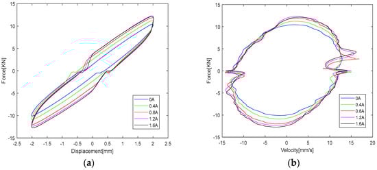 So as to explore the impact of different current inputs on the performance of the damper, the damper was tested under excitation at the same frequency and amplitude, and the input current was adjusted. The vibration excitation is at a frequency of 1 Hz and an amplitude of 2 mm, and an external DC current of 0–1.6 A is fed to the damper in steps of 0.4 A, with a gradual increase in current strength. The maximum current was increased to 1.6 A because it was found that the force–displacement curve of the damper basically did not change when 1.6 A and 2 A currents were added to the damper, indicating that the MR fluid in the damping channel had reached magnetic saturation when a 1.6 A current was input to the damper.