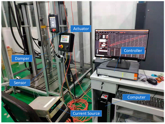 Figure 8, it is a set of dynamic test systems, which is composed of a controller, sensor, computer, actuator, and external current source. The input excitation signal is given by the computer system, and, finally, the vibration excitation is generated by the actuator, so that the damper starts to work. The displacement, output force, and other data of the damper are measured by the sensor and stored on the computer. The current of the external current source can be manually adjusted to estimate the dynamic mechanical performance of the damper under different external currents.