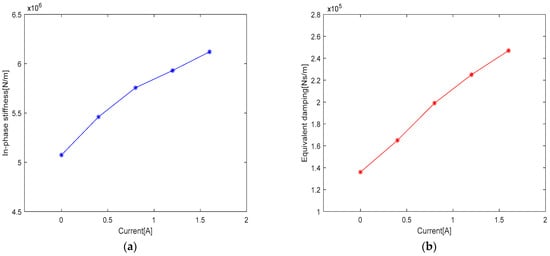 Figure 10, the in-phase stiffness increases from 5074 kN/m at no current to 6120 kN/m at 1.6 A current, with a gain of 20.6%. The equivalent damping increases from 136 kNs/m at no current to 247 kNs/m when the current is 1.6 A, and the gain is 81.6%. Obviously, the increase in the stiffness and equivalent damping has no relation with the elastomer in the damper, but it occurs because the MR fluid changes with the change in current.