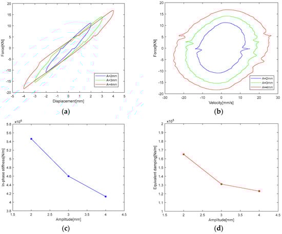 Figure 11 shows the damper’s force–displacement curve, force–velocity curve, in-phase stiffness, and equivalent damping changes under excitations with amplitudes of 2 mm, 3 mm, and 4 mm, keeping the applied current at 0.4 A and the vibration frequency at 1 Hz. Obviously, when the vibration amplitude increases, the damping force generated by the damper increases significantly. On the contrary, the in-phase stiffness and equivalent damping decrease to a certain extent.