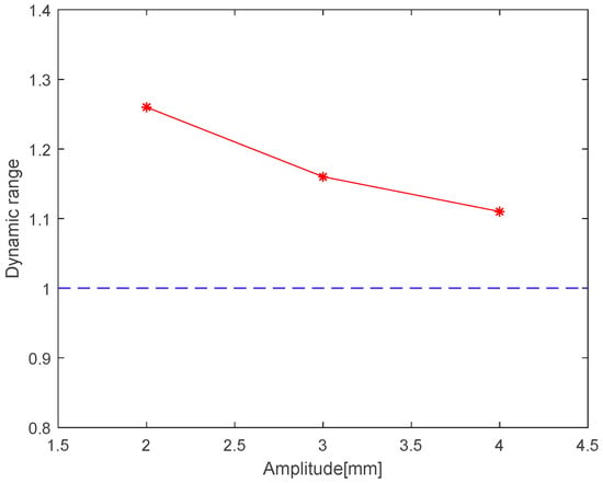 Figure 12 shows that the dynamic range decreases with the increase in excitation amplitude, and when the amplitude is between 2 mm and 4 mm, this value is between 1.1 and 1.3. Compared with the conventional MR fluid damper, the dynamic range of the damper is much smaller, because the rubber provides a large force, while the MR fluid provides a relatively limited force. However, compared with the simple elastomer damper, the damper has a certain regulation ability.