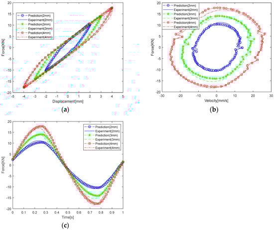 The experimental and predicted force–displacement curves, force–velocity curves, and time–force curves of the damper at different excitation amplitudes with a frequency of 1 Hz and at an input current of 0.4 A are shown in