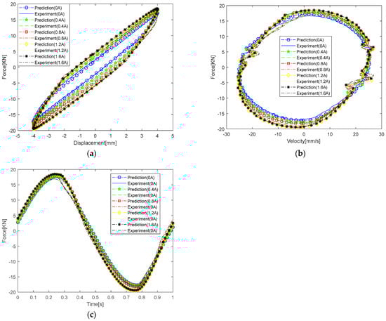 Figure 16 also shows the force–displacement curves, force–velocity curves, and time–force curves for different currents, as well as the predicted values of the damper under excitation with a frequency of 1 Hz and an amplitude of 4 mm. Similarly, the experimental values agree well with the predicted values, again demonstrating the accuracy of the established mechanical model.