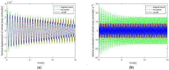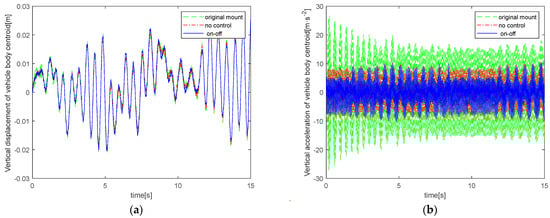 Table 5 that, compared with passive control, on–off control has no obvious change in the RMS value of acceleration of the vehicle body, but on–off control effectively reduces the RMS value of acceleration of the vehicle body centroid, and it also has better vibration isolation rate. This is because the shock absorber is mainly used to reduce the transmission of vibration excitation generated by the engine to the vehicle body, while the displacement excitation generated by the engine is relatively small compared with the road displacement excitation, and the acceleration excitation cannot be ignored compared with the road acceleration excitation. Therefore, on–off control vibration reduction has a more obvious effect on reducing the RMS value of vehicle body acceleration than passive vibration reduction, but the magnitude of the RMS value of vehicle body centroid displacement has little relationship with the control method.