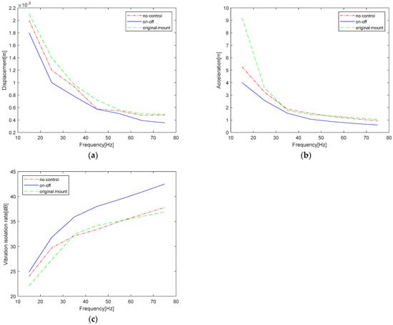 Figure 18. Simulation results show that the new mount is better than the original mount under such conditions, with or without the use of control. For a comparison of the effect of the new mount using on–off control and with no control, from the response curve, it can be seen that on–off control has better damping effect compared with no control, and it can effectively reduce the root mean square value of displacement and acceleration of the vehicle body. The formula for calculating the vibration isolation rate of the shock absorber is shown in Equation (44). At 35 Hz, the vibration isolation rate of no control is 32.1 dB, while the vibration isolation rate of on–off control is 35.9 dB, which is 11.8% higher than that of no control.