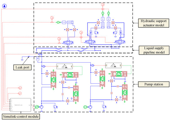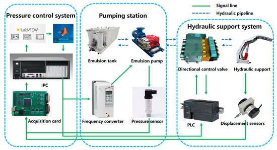The construction of intelligent mines in China is developing at a high speed. In order to meet the accelerating mining speed of the working face, higher requirements are put forward for the reliability and stability of intelligent mining of the fully mechanized working face [1,2]. As the power source of hydraulic support in a fully mechanized mining face, the emulsion pump station directly affects the working efficiency and stability of hydraulic support, which is the key equipment to ensure the safety and high efficiency of coal mine production [3,4]. Due to the coupling relationship between the operating speed, action type, working resistance, fluid supply flow and system pressure of the hydraulic support system [5], the pressure-transient characteristics of the hydraulic support system are obvious. Meanwhile, with the increase in working resistance of the hydraulic support at large mining height and the increase in working face length, the problem of poor stability of fluid supply pressure becomes more obvious. Therefore, how to improve the stability of the fluid supply system as much as possible under different working conditions of hydraulic support is an important and complicated problem to be solved urgently in the fluid supply control of an emulsion pump station.