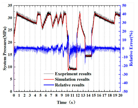As shown in Figure 4, the overall change trend of system pressure measured by experiment is in good agreement with the simulation results under rated fluid supply conditions. It is divided into five stages, which are hydraulic support in no action leakage stage, descending, pulling, raising, and pushing actions. In the pulling stage, the system pressure fluctuates frequently in the operating pressure range of the unloading valve because the fluid supply flow is greater than the fluid demand of the system. On the contrary, due to the large demand for fluid in the system, the fluid supply is insufficient in the raising and pushing stage. The minimum system pressure drops to 8.9 MPa, and the maximum pressure fluctuation is 22.6 MPa. The maximum relative error and the average relative error between the simulation results and the experimental results are 16.70% and 3.73%, respectively, and the experimental results have good consistency with the simulation results, which verifies the validity of the simulation model of the hydraulic support system.