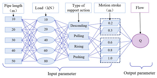 According to the optimal flow rate requirements introduced in the previous section, the optimal flow output dataset of the hydraulic support system under different working conditions was determined by simulation, and based on the relationship between the inputs of the obtained dataset and the corresponding outputs, a GRNN prediction model connecting the optimal flow output value with four environmental parameters, namely the type of action of the hydraulic support, the stroke of the action, the length of the pipeline, and the load of the actuator, was established.