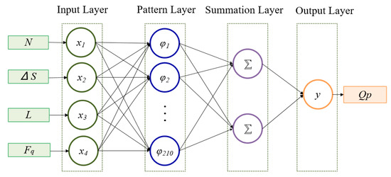 A GRNN neural network for predicting the optimal flow output was constructed. There are four layers in the GRNN model, an input layer, a pattern layer, a summation layer, and an output layer [30,31]. The model structure is shown in Figure 8. The input layer consists of four simple neurons, which pass the four input parameters of hydraulic bracket action type N, hydraulic cylinder action stroke , pipe length L, and actuator load Fq directly to the pattern layer, which contains 210 neurons, where each neuron corresponds to a different training sample, and the transfer function of the neurons in this layer is a Gaussian function [32,33]: