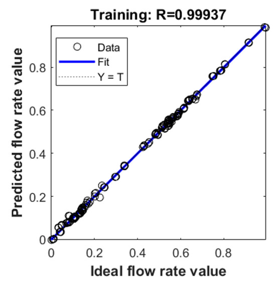 A GRNN model has been developed which can be used to predict the optimum regulated supply flow rate to be set for the emulsion pump under different operating conditions. In Figure 9, the predicted data using the GRNN model are compared with the training data. It can be seen that after training and fitting, the final average relative error of the training set flow rate values was obtained to be 0.94%, and the R2 value reached 0.9989 when training the GRNN model.