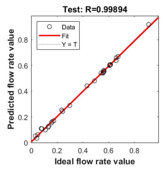 To test the learning ability of the model, the trained GRNN model was tested using the test set. Figure 10 compares the predicted supply flow values with the test supply flow values. The results show that after training and fitting, the average relative error of the final test set flow values is 1.02%, the R2 value during the model testing reaches 0.9985, and the correlation coefficient R reaches 0.99894. Therefore, the established GRNN model can be used to predict the optimal set of fluid supply flow of the hydraulic bracket system, which can satisfy the demand of steady-pressure fluid supply with high accuracy.
