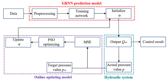 Because of the complex and changeable working conditions of hydraulic support, it is difficult for an offline algorithm to predict new working conditions, so an online updating prediction algorithm is needed to identify the model fitting in real time to ensure continuous learning to adapt to the new working conditions. The flowchart of the online updating control approach can be summarized as shown in Figure 11.
