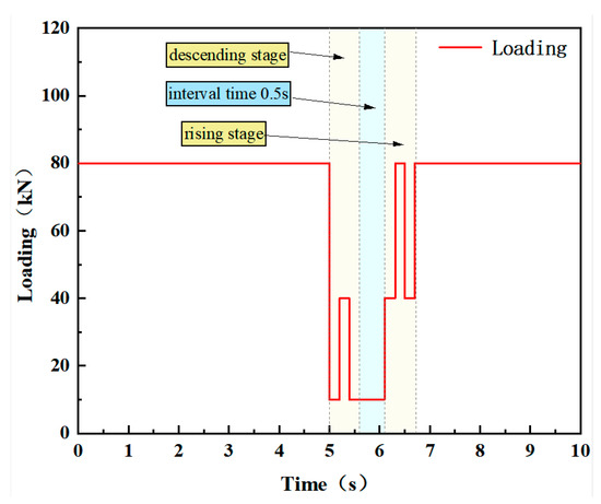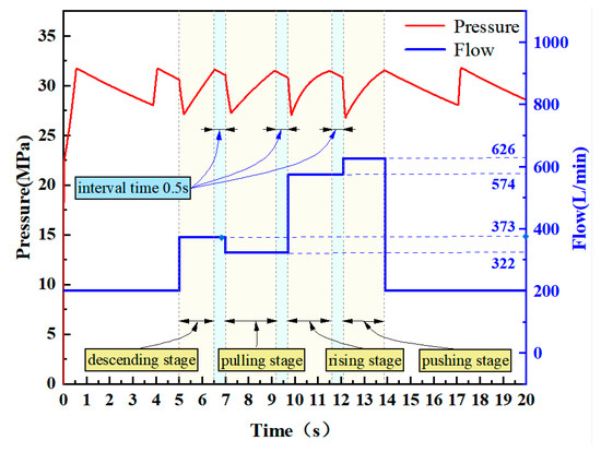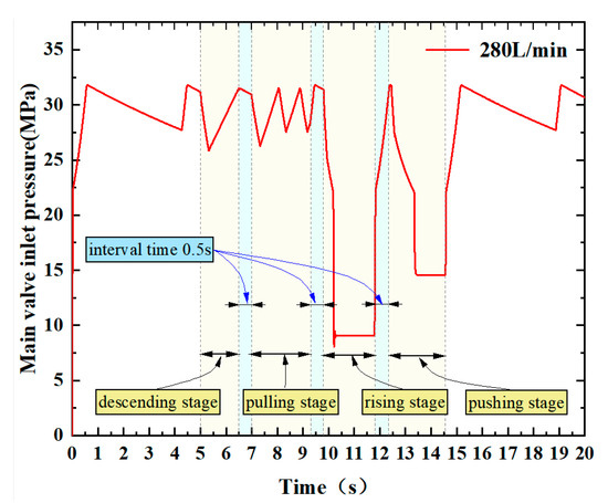 As can be seen from the system pressure data in Figure 5, because the different operating modes of the hydraulic support actuator (descending, pulling, raising, and pushing actions) have great differences in the demand for fluid supply flow, and the loads are strongly time-dependent, this results in corresponding sudden changes in system pressure. According to the classification of different amounts of fluid consumption of the hydraulic support in the working face, the operation of the working face hydraulic support is divided into three typical working conditions, and there are different degrees of pressure fluctuations in each working condition: