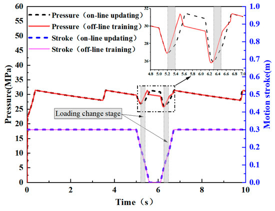 In the simulation, varying loads are applied in the operation stages of the simulated column raising and descending action stages, and the load signals are shown in Figure 14. Under the variable load conditions as shown in Figure 14, GRNN neural network trained offline and GRNN neural network updated σ online were used to control the steady-pressure fluid supply, and the pressure curves of the simulated column raising and descending action were collected, as shown in Figure 15. As can be seen from Figure 15: When the offline trained GRNN neural network is used for the steady-pressure fluid supply control, due to the sudden increase in load at 5.2 s and 6.3 s, the output flow of the emulsion pump station cannot adapt to the changing working conditions in time. As a result, the system pressure reaches the unloading pressure before the cylinder reaches the target stroke at 5.5 s and 6.7 s. At this time, the unloading valve is in the unloading state, and the output flow of the emulsion pump station cannot enter the system, so the flow control of the pump station is invalid. In contrast, when using the GRNN neural network of online updating σ for steady-pressure fluid supply control, in the stage of a sudden increase in load, due to excessive fluid supply flow, the system pressure change rate suddenly changes, and the cylinder moving speed changes, especially in the process of raising and descending action, but because the output flow is constantly updated to adapt to the load force, the system pressure does not fluctuate greatly. And the actuator completes the raising and descending action smoothly. The results show that the pressure change of the system is more stable when the GRNN neural network is updated and trained online, and it has good adaptability.