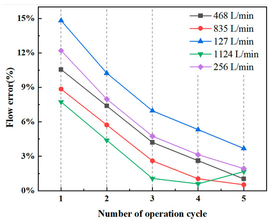 In order to simulate the system leakage condition above, a throttle port with an opening diameter of 3 mm is designed in the pipeline in the simulation model, the steady-pressure fluid supply control is carried out by online updating training, the system pressure is compared with the ideal target pressure of steady-pressure fluid supply at the end of each hydraulic support action, and the training dataset and the smoothing parameter σ are updated. The fluid supply flow during each operation cycle under five different working conditions was randomly recorded and compared with the optimal steady-pressure fluid supply flow under corresponding working conditions. The error is shown in Figure 16. It can be seen that when the system leaks, the error between the output flow calculated by the GRNN neural network trained offline in advance and the optimal steady-pressure fluid supply flow reaches a maximum of 14.8%. However, due to the online updating of σ, the error between the output flow and the optimal steady-pressure fluid supply flow decreases continuously with the adjustment of the fluid supply flow during each operation cycle until the fifth online updating control. The error is all controlled below 3.7%, which meets the requirements of pressure control of hydraulic support.