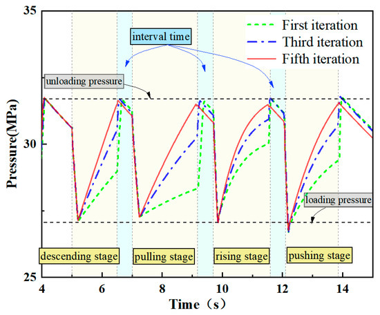 The changes in the system pressure curves under the online updating control for several times are shown in Figure 17. From the figure, it can be seen that during the first hydraulic support cycle action, the system pressure cannot rise stably due to the system leakage. At the moment of the end of the action, the difference between the system pressure and the unloading pressure is large, resulting in a sudden increase in the system pressure after the reversing valve action, causing a system pressure shock. With each online update control to adjust the amount of fluid supply, during each hydraulic support action, the system pressure rise tends to stabilize until the fifth online updating control; at the end of the hydraulic support action, the system pressure shock basically disappeared. This shows that the online updating GRNN neural network has good adaptability under sudden changes in working conditions.