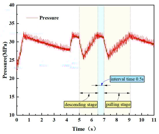 In order to further verify the executability of the control method, an experimental study was carried out through the constructed experimental platform. Since the total flow rate of the two emulsion pumps in the experimental platform is up to 280 L/min, this paper only studies the two action processes of descending and pulling, which use less fluid. The adjusting pressure of the proportional relief valve at the outlet of the loading pump is set to 20 MPa, which can achieve the loading force loading of the actuator. The flow output of the emulsion pumping station is controlled by the online updating steady-pressure fluid supply flow of the GRNN neural network, and after several online updates, the system pressure curve during the hydraulic support action is measured by the pressure sensor, as shown in Figure 18.