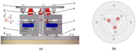 The overall structure of the three-degree-of-freedom piezoelectric drive micro-positioning platform. (a) Front view. Micro-positioning platform components: Moving platform (1). Scaffold (2). Displacement amplifier (3). Hexagon socket screw (4). Hexagon socket screw (5). Displacement sensor (6). Piezoelectric ceramic actuator (7). Fixed platform (8). (b) Vertical view.