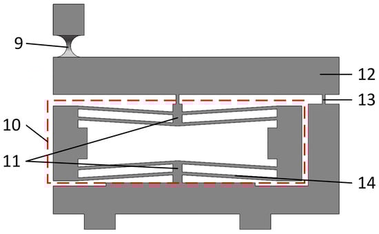 The structure of the displacement amplification mechanism. Displacement amplification mechanism components: A new type of biaxial flexible hinge (9). Compound bridge-type displacement amplification mechanism (10). Connecting member (11). Lever-type displacement amplification mechanism (12). Corner-filleted flexure hinge (13). Long straight beam flexible hinge (14).