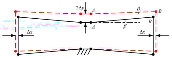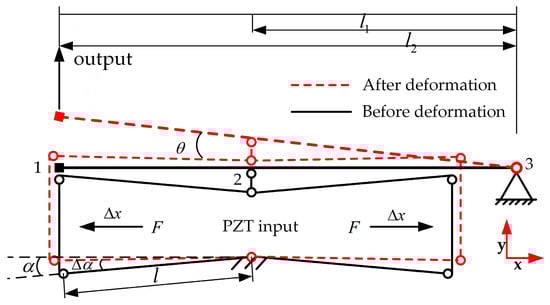 In Figure 7, the black solid line is the initial position before the force deformation of the composite bridge mechanism, and the red dotted line is the position after the force deformation. and are the two endpoints of the compound bridge displacement amplification mechanism. The angle between the long straight beam flexible hinge and the horizontal direction before the movement is . When the two ends of the piezoelectric ceramic actuator output displacement , respectively, the compound bridge mechanism outputs the amplified input displacement at , and the output displacement is . The angle between the long straight beam flexure hinge that reaches the new equilibrium position and the horizontal direction is , and the angle of rotation at points and is