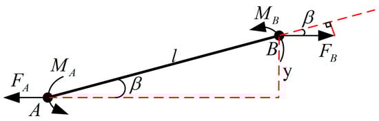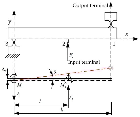 Figure 4 shows the force analysis of the lever structure. In Figure 4, the black solid line is the initial position before the force deformation of the lever mechanism, and the red dotted line is the position after the force deformation. is the input force to the lever section, is the total length of the lever, and is the length of the lever between point 1 and point 2. The size of the straight beam flexible hinge at point 1 and point 2 is exactly the same. It is assumed that and are the force and moment of the straight-arm flexure hinge at two points, respectively, and are the deformation and rotation angle of the flexure hinge, respectively, and the rotational stiffness and tensile stiffness of the straight-arm flexure hinge are and , respectively. Then, the torque and force of the flexure hinge have the following relationship with the deformation: