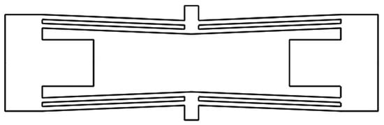 As shown in Figure 2, the displacement amplification mechanism is mainly composed of a lever mechanism [] and a compound bridge mechanism []. The new two-axis flexure hinge only plays the role of connecting the moving platform. Eight long straight beam flexure hinges and connecting blocks together form four symmetrically distributed parallelogram guiding mechanisms, which can reduce the coupling motion of the micro-positioning platform and improve its positioning accuracy.