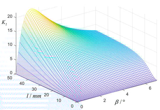 According to Equation (24), it can be seen that the magnification of the bridge displacement amplification mechanism is mainly affected by the thickness , length , and tilt angle of the hinge. As shown in Figure 9, when the tilt angle of the flexure hinge gradually increases, the magnification first increases rapidly and then decreases slowly. When the length of the flexible hinge increases gradually, the magnification also increases gradually. When the tilt angle