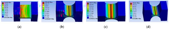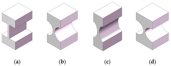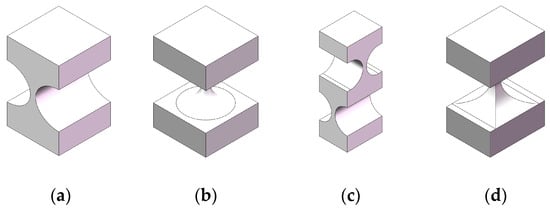 The notch shape of the flexure hinge has an important influence on the accuracy, life, and output displacement of the flexure hinge. According to the characteristics of its cross-section shape, the uniaxial flexible hinge unit can be mainly divided into four different hinge types []: straight beam type, semi-circular type, elliptical type, and hyperbolic type (see Figure 11a, Figure 11b, Figure 11c, and Figure 11d, respectively).