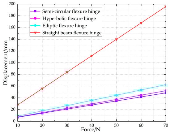 It can be seen from Figure 13 that there is a linear relationship between the elastic deformation and the input force of the four different flexible hinges. In the case of the same input force, the deformation of the straight beam flexure hinge is the largest, followed by the elliptical flexure hinge, while the hyperbolic and semi-circular flexure hinges are relatively small. Therefore, the straight beam flexible hinge is used as the flexible hinge in the displacement amplification mechanism.
