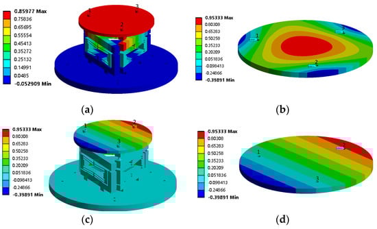 When 25 μm is input at both ends of the mounting end face of the No.2 piezoelectric ceramic actuator, the piezoelectric drive micro-positioning platform will rotate around the x-axis. The simulation results are shown in Figure 14c,d. The maximum output displacement of the moving platform at point 2 connected to the No.2 displacement amplification mechanism is 804 μm, which is converted into a rotation angle of 0.665°. At the same time, there are slight coupling phenomena at point 1 and point 3.