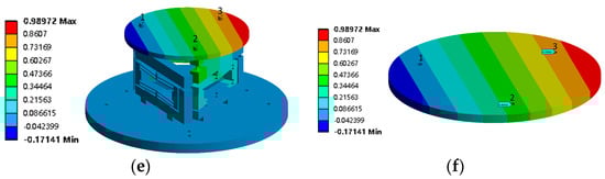 When 12.5 μm and 25 μm are input at both ends of the mounting end faces of No.2 and No.3 piezoelectric ceramic actuators, the piezoelectric drive micro-positioning platform will rotate around the y-axis. The simulation results are shown in Figure 14e,f. The maximum output displacement of the moving platform at point 3 is 799 μm, and the output displacement at point 2 is 404 μm. According to the formula, it is converted into a rotation angle, which is 0.572°. At the same time, it can be seen that there is also a slight coupling at point 1.