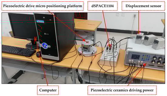 Realization of control schemes on the computer used MATLAB/Simulink(R2018a) and controldesk 6.4 software. The computer generates input signals and transmits them to the controller. The controller is dSPACE1104, produced by the dSPACE Ltd. in Paderborn, Germany. The dSPACE1104 controller is responsible for sending drive signals and receiving acquisition signals. The drive power supply is RH13, produced by the Harbin Rongzhi Nanxin Technology Co., Ltd. in Harbin, China. The analog signal is amplified and output to the piezoelectric stack actuator through the voltage and power amplifier circuit inside the power supply. The sensor adopts the Keanes EX-110 V eddy current displacement sensor, the amplification unit is EX-V02, the range is 0–2 mm, the resolution is 1 μm, and the maximum sampling frequency is 40,000 times per second. The sensor collects the signal and processes it before feeding it to the dSPACE1104 controller. The controller feeds the signal into the computer, which displays the signal in the controldesk software.