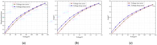 Similarly, the maximum output experimental test is performed on the rotation around the x/y axis. The relationship between the rotation angle of the x/y axis and the corresponding voltage is shown in Figure 16b and Figure 16c, respectively. It can be seen from Figure 16b,c that the step-up curve does not coincide with the step-down curve, and has obvious hysteresis. The maximum output angle around the x-axis is 0.649°, and the maximum output angle around the y-axis is 0.534°. When the loading voltage is 30 V, the hysteresis angle around the x-direction is the largest, which is 0.064°. When the loading voltage is 15 V, the hysteresis angle around the y-direction is the largest, which is 0.065°.