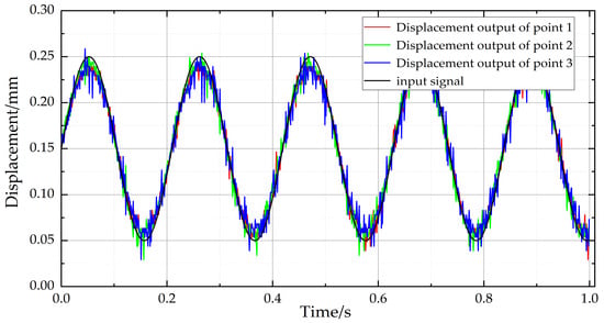 The micro-positioning platform achieves output in different directions by controlling the output displacements of the three displacement amplification mechanisms. Therefore, experiments are conducted in the z-direction to verify the dynamic output performance of the micro-positioning platform. The closed-loop control scheme is built in MATLAB/simulink and controldesk software. The input signal is set to be the sinusoidal signal with an amplitude of 50 μm, a frequency of 4.75 Hz, and a bias of 150 μm. From the experimental results, it can be seen that the output displacement of the platform is basically the same as the input signal.