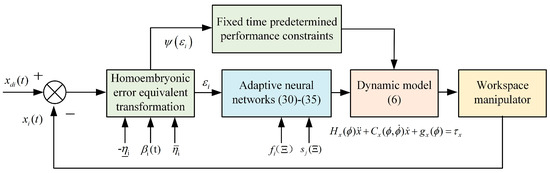 The control framework diagram for trajectory tracking control of a workspace manipulator based on a fixed-time adaptive neural network is illustrated in Figure 2. The control system begins with an error equivalent transformation using a homoembryonic approach, which ensures rapid convergence of tracking errors. This is followed by the application of fixed-time predetermined performance constraints. Adaptive neural networks are then employed to approximate dynamic parameters and adjust the controller. The dynamic model of the manipulator is controlled to achieve precise trajectory tracking within a fixed timeframe, optimizing both speed and accuracy. The workspace manipulator’s state is dynamically adjusted to meet the desired performance criteria.
