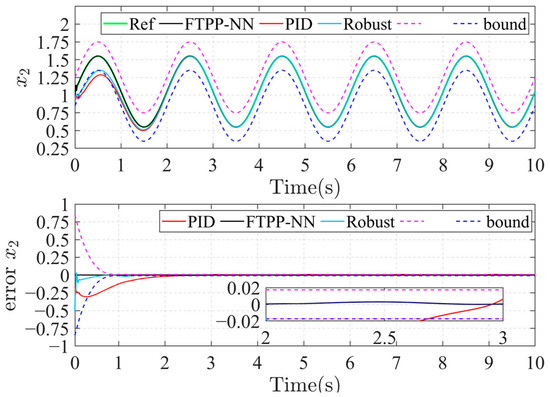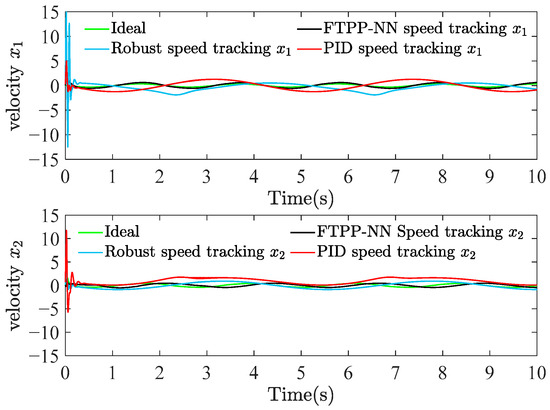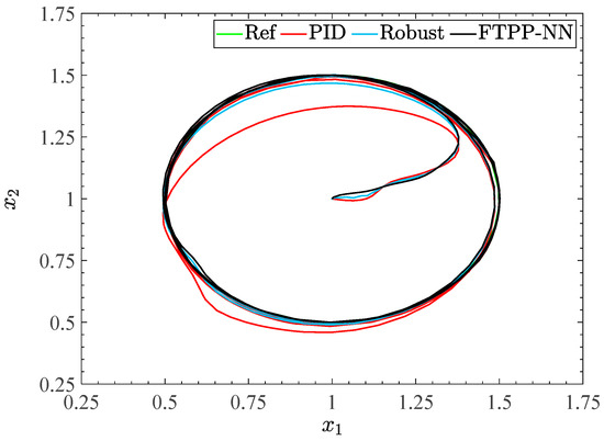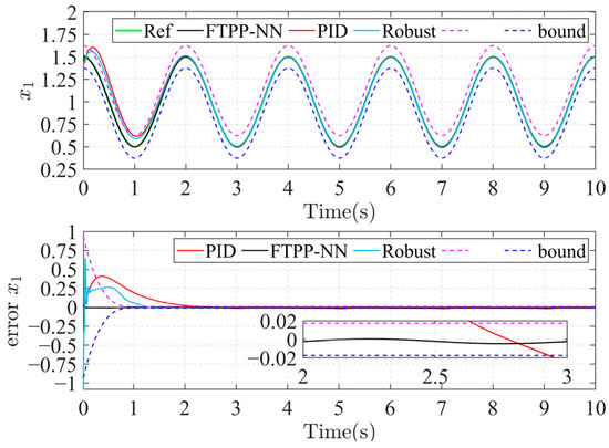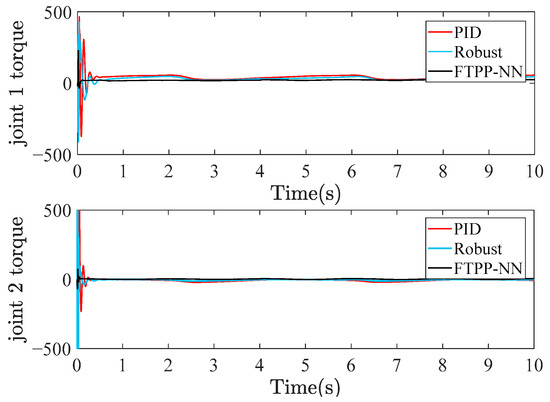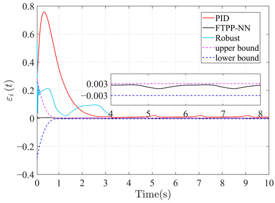 The simulation results are shown in Figure 3, Figure 4, Figure 5, Figure 6, Figure 7, Figure 8, Figure 9, Figure 10 and Figure 11. Figure 3 illustrates the trajectory tracking performance of the proposed algorithm applied to the manipulator and compares it with the PID and robust control algorithms under the same conditions. The results indicate that all three control methods can achieve the desired trajectory tracking. However, the proposed workspace manipulator adaptive neural network control method based on time preset performance (hereafter referred to as FTPP-NN) demonstrates faster tracking speed and higher accuracy, achieving precise tracking within the preset 1 s. Notably, the tracking errors of the PID and robust control methods exceed the boundaries during the initial phase, whereas the FTPP-NN method ensures that the tracking error remains constrained within the boundaries at all times, thereby improving both the transient and steady-state performance of the system.
