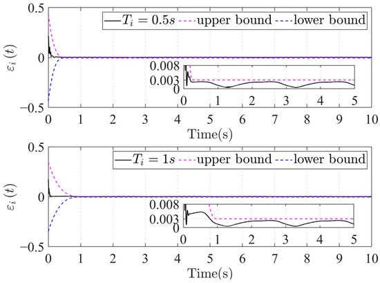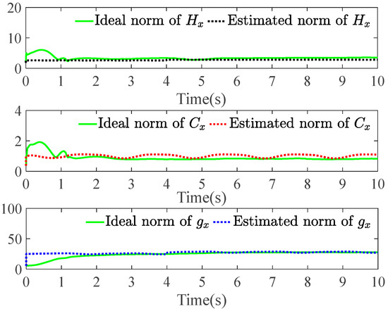 All Gaussian functions’ parameters are assumed to be putting the neural network’s starting value at 0. Equations (37) and (42)–(44) employ the adaptive law and the control law, respectively. The controller gains are chosen as and . By Lemma 2, is taken and the parameters of the adaptive law are taken as , and .