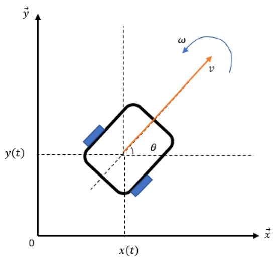 where x and y denote the position along the x-axis and the y-axis, respectively; represents the linear speed associated with the center of mass; is the orientation angle; is the angular speed of the center of mass; a is the acceleration; and u represents the input vector . Then, the generalized robot model is given by