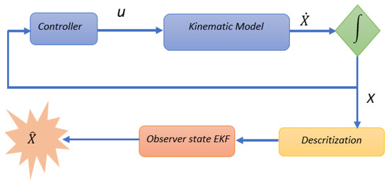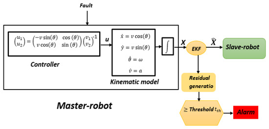 Master–slave systems often provide data security, improved consistency, and robust fault tolerance. However, their significant drawback arises in the event of master failure, which can lead to the entire system’s failure, causing process malfunctions and subsequent degradation in performance [7]. Hence, the necessity of implementing process monitoring and fault detection systems becomes paramount, especially in applications like wheeled robots. This prompts exploration into fault diagnosis techniques to effectively address this challenge. Fault detection and isolation (FDI) has garnered substantial attention in both academic and industrial spheres, as evidenced by recent publications, for example, [8]. According to [9], this methodology is typically categorized into three overarching groups: hardware redundancy methods, model-based methods, and signal analysis methods. There are two other main forks: quantitative approaches and qualitative approaches. In the literature, considerable attention has been directed toward the observer-based technique. For instance, in [10], a method utilizing Kalman filter identification was utilized for the detection and isolation of sensor faults within mobile robotic systems. Also, in [11], the authors presented the integration of a bank of Kalman filters with an expert system for the detection and isolation of sensor faults in mobile robots. Additionally, [12] introduced a Kalman filter designed for joint state prediction and unknown input estimation within linear stochastic discrete-time systems subject to intermittent unknown inputs in measurements. FDI in nonlinear systems has increased significantly in recent years because most of the systems we encounter in practice are nonlinear. For example, in [13], the FDI system is based on a single-model EKF filter that generates residuals as soon as the behavior of the aircraft deviates from the expected trajectory. Also, refs. [14,15] directed their focus toward fault detection in wheeled mobile robots utilizing an EKF filter. The fault detection process typically involves two primary steps: residual generation and subsequent residual evaluation. In our contribution, we will emphasize the observer-based approach, particularly the utilization of the extended Kalman filter.