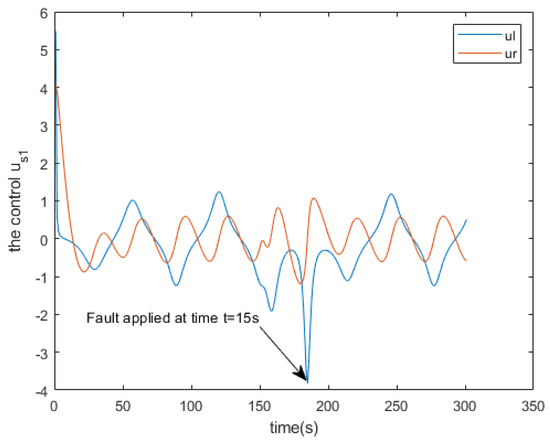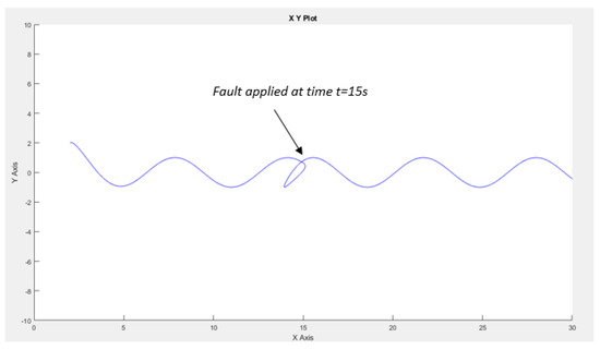 Furthermore, upon introducing a fault (considered an intermittent fault, such as a switch) to a parameter at time t = 15 s, a minor peak is observed (see Figure 17), after which the robot promptly returns to its intended trajectory. Hence, it can be concluded that the Extended Kalman Filter effectively identifies the fault introduced into the system.